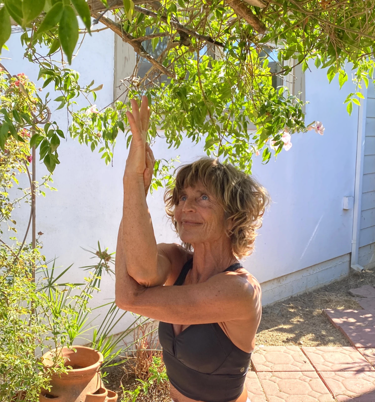 - En inspirant, levez lentement un bras sur le côté et vers le ciel. Laissez vos yeux suivre la main supérieure et ouvrez la poitrine.
